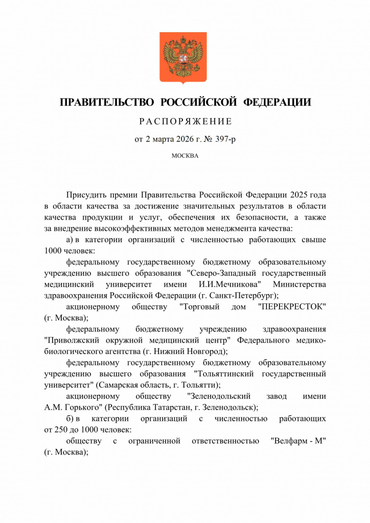 Распоряжением Правительства РФ от 02 марта 2026 года № 391-р ЦСМ Росстандарта в Свердловской области присуждена Премия Правительства РФ 2025 года в области качества «за достижение значительных результатов в области качества продукции и услуг, обеспечения их безопасности, а также за внедрение высокоэффективных методов менеджмента качества».